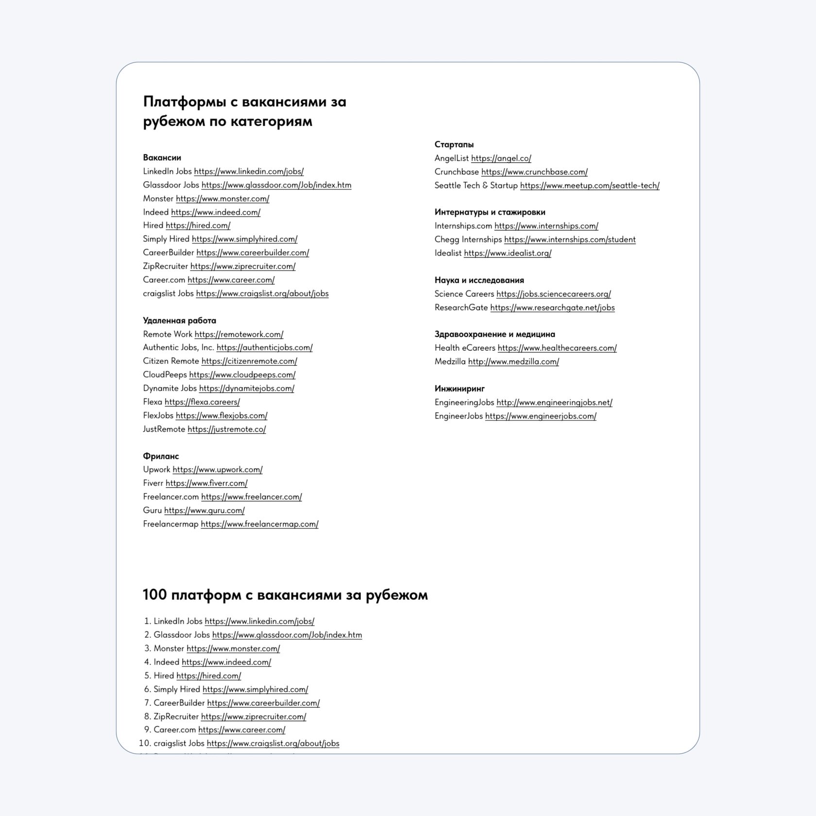 Мы собрали для вас список из 100 актуальных платформ с вакансиями за рубежом и подготовили понятный пошаговый маршрут который поможет начать поиск работы за границей без хаоса и лишних попыток. Если вы мечтаете работать за рубежом, но не знаете с чего начать, этот чек лист станет вашим надежным проводником.